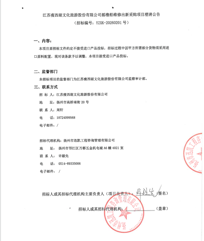 江苏瘦西湖文化旅游股份有限公司摇橹船维修出新采购项目澄清公告