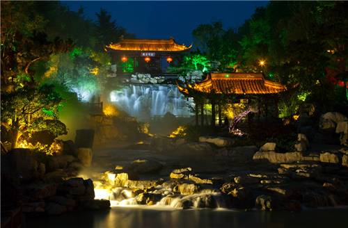 景观构筑物照明中体现生态休闲和文化游憩,体现中国古典山水园林的古朴、儒雅,以白色为基调,暖黄、红色为衬托,以少量活泼动感的色调为搭配,运用灯光强化环境的特色。